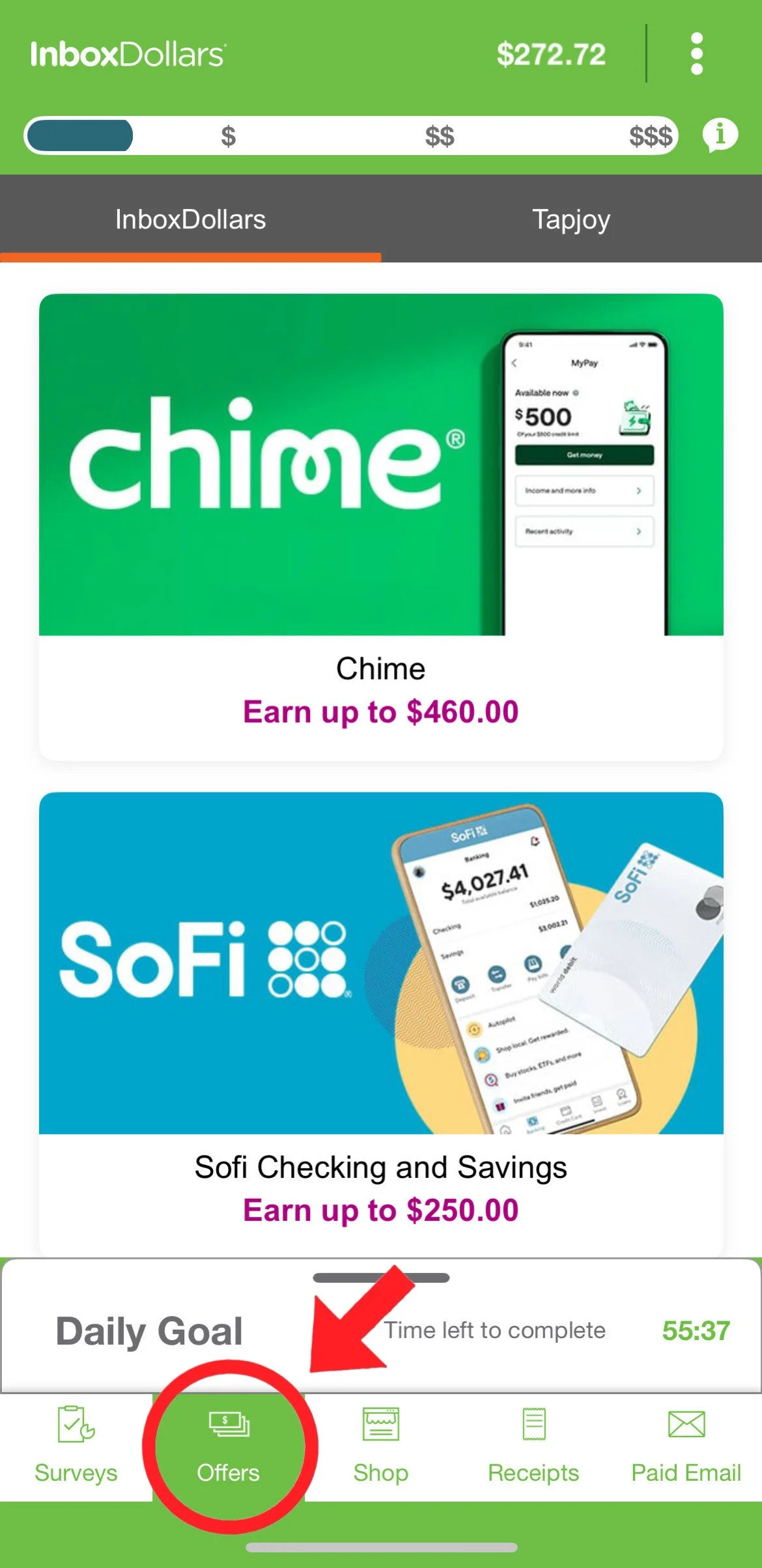 How to Find: Go to Offers tab in InboxDollars, scroll until you find Chime